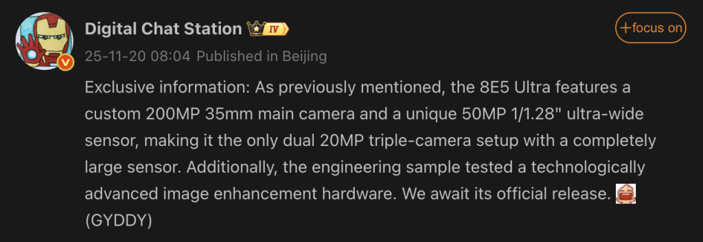 Theo thông tin mà Digital Chat Station chia sẻ trên Weibo, vivo X300 Ultra vẫn giữ nguyên lộ trình sử dụng cảm biến chính tùy chỉnh với độ phân giải 200 MP kết hợp ống kính tiêu cự 35 mm. Cảm biến này được cho là Sony LYT-910, kích thước 1/1.12 inch.